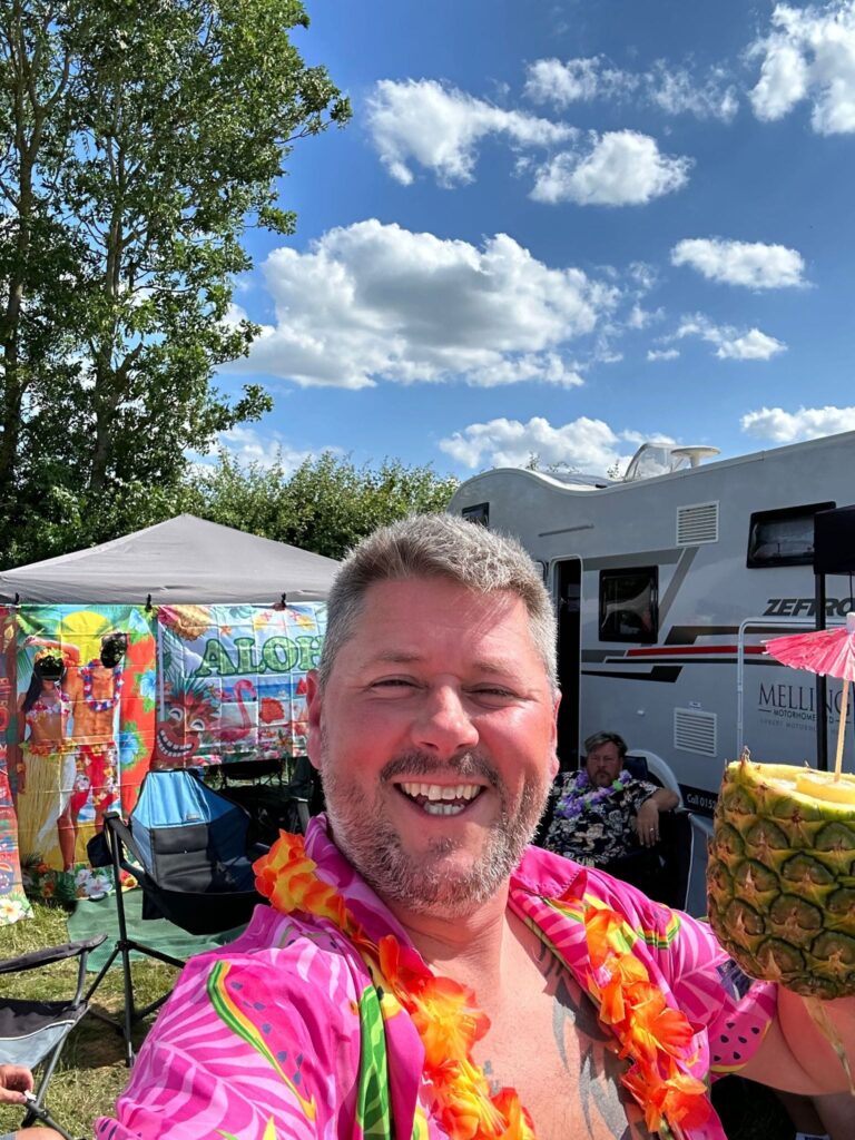 The mad tiki party roared to life under a sky of flaming torches and neon-lit palm trees. Guests in wild Hawaiian shirts and grass skirts danced barefoot on the sand (grass), sipping fruity cocktails out of carved coconuts and hollowed pineapples. Giant inflatable flamingos bobbed in the pool, and a DJ spun tropical beats mixed with chaotic drum solos that sent the crowd into a frenzy. Every corner hid a new surprise — this year we will have fire breathers, hula hoop contests, and a conga line that stretches halfway around the campsite. It wont be just a party; it will be a full-blown, rum-soaked F1 adventure where reality melts into the rhythm of the night.